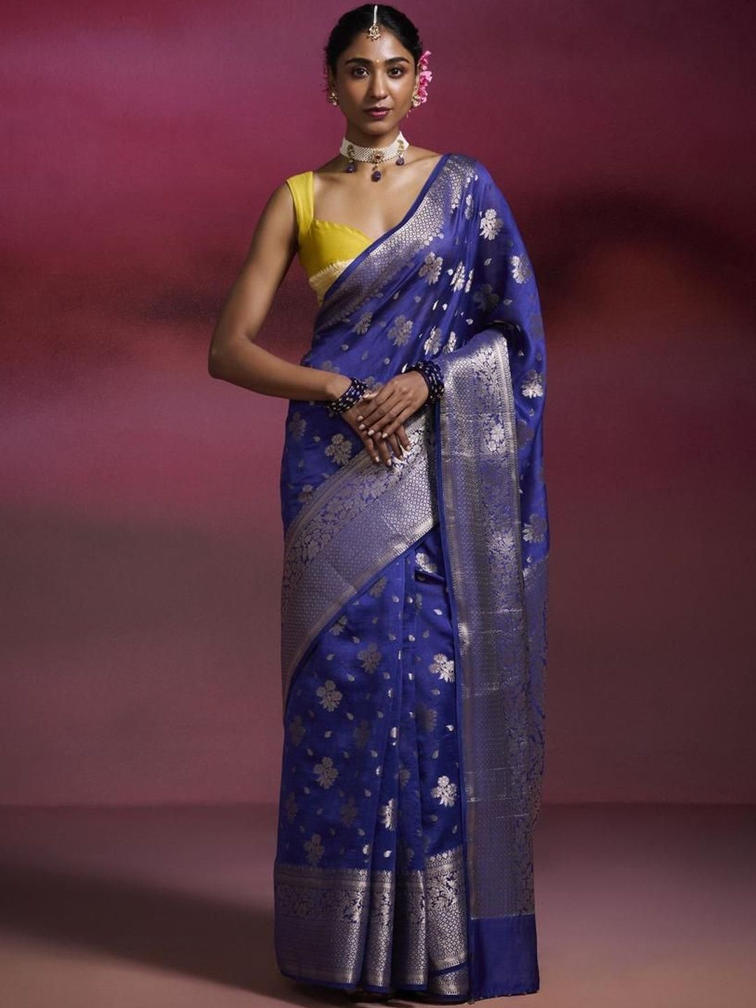 Dressfolk Ink Blue Woven Design Banarasi Silk Cotton Saree With Zari Border & Floral Butta