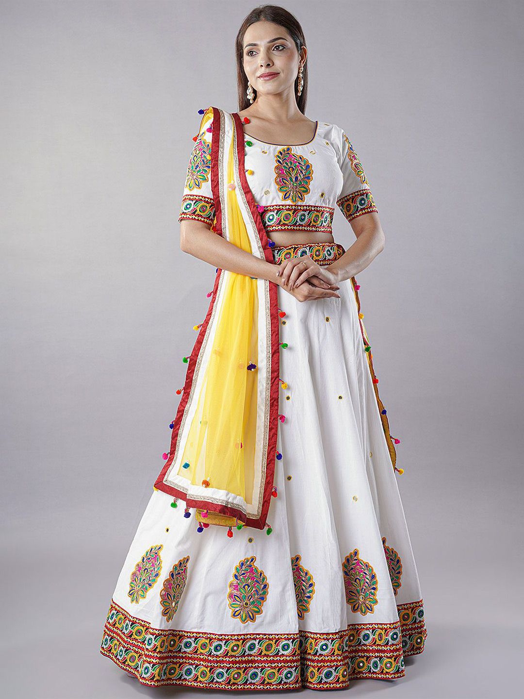Readymade cotton lehenga in white and yellow and red colour. This navratri special attire with cotton lining is enhanced with resham, mirror, pom-pom and kutch work. Available with a cotton choli in white and yellow and red colour crafted in round neck and half sleeves and a net dupatta in yellow and white color. The choli and lehenga lengths are 13 to 18 and 42 inches respectively.